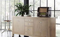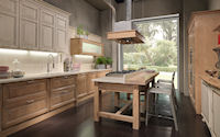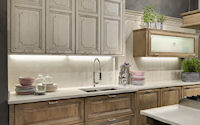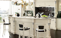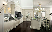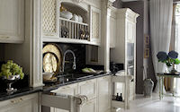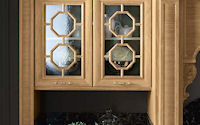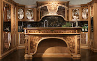 Сочетание натурального и лакированного дуба в мягких пастельных цветах слоновой кости, является фоном для классической темы класической ручной резьбы по дереву. Пространство обретает завершенность с рабочей зоной острова для приготовления пищи, вдохновленной столом старинной ремесленной работы.