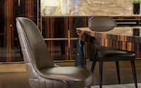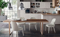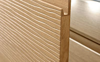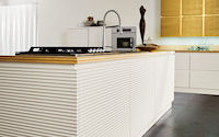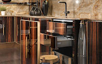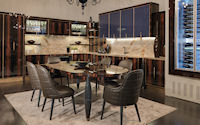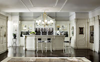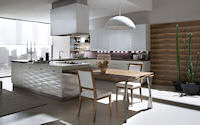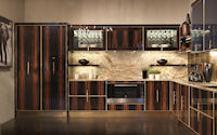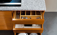 Форма и традиционный подход обогащены неожиданными выдвижными функциональными элементами, такими как съемные контейнеры за декоративными колоннами. Приготовлению пищи придается сильное визуальное содержание, сокрытое в гораздо более технологичном сердце кухни, где традиции и инновации сливаются воедино. Большое внимание внимание уделяется всем аспектам освещения, особенно декоративной подсветке, которая, безусловно, обеспечивает подходящую среду, где это необходимо для работы.