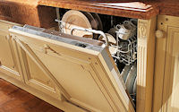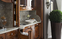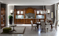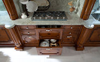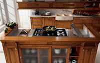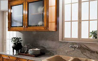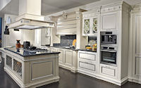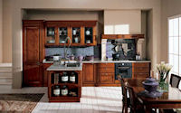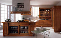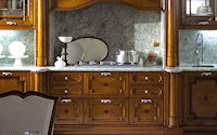 Отдельного упоминания заслуживают материалы, используемые в кухне Елизабет: фасады изготовлены с использованием отобранного вишневого дерева, в сочетании с вставками ореха, чье качество и однородность и сегодня возведено в принцип на очень высоком уровне, с отделкой и патиной в истинных традициях мастерства.