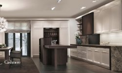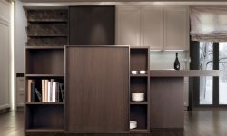 Строгость и современный стиль коллекции Cashmere подчёркивает ценность материалов. Гармоничное использование дерева, мрамора и металла придаёт проекту особую красоту, основанную на прочности и качестве. Дерево дуба окрашенное по методу "открытые поры" чередуется с деревом ореха матовой отделки; мрамор ‘emperador dark’, обработанный с добавлением по краям тёмного ореха, обогащает предметы коллекции. Универсальный смежный шкаф из ореха с раздвижными дверцами разделяет пространство на две части: кухню и гостиную.