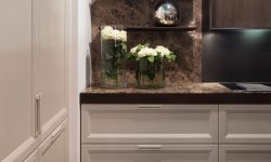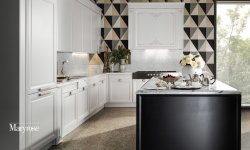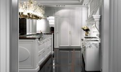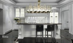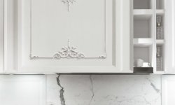 Эксклюзивная роспись по дереву, созданная по нашим эскизам и резные деревянные капители, напоминающие типичные фризы классического искусства, являются отличительной чертой коллекции ROMA. Детали из латуни, выделяющиеся на белом матовом фоне, украшают отделения рейлингов и уникальные в своём стиле, ручки. Внушительной толщины возвышение из ореха с фигурным краем доминирует на кухонной стойке, по бокам которой могут быть нанесены инициалы хозяев дома, придавая мебели особую эксклюзивность. На днища и спинки аккуратно нанесена "кружевная" отделка, напоминая о неповторимости и изысканности стиля барокко.