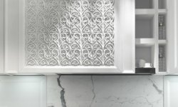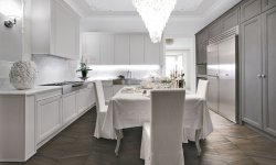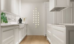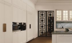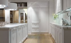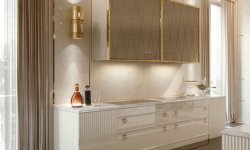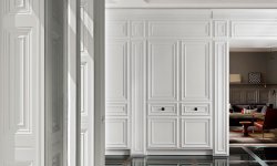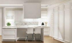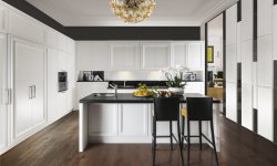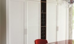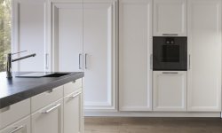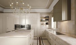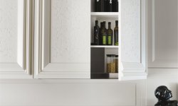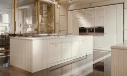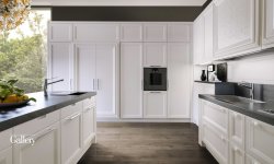 Решение коллекции Gallery в белом цвете, состоит из чистых линейных форм реализованных с дверцами открывающимися с помощью системы TIP-ON и находящимися в колоннах бытовые электроприборы, буазери и задними стенками, обогащенными выгравированным мелким узором à grands ramages.