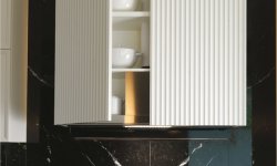 Столешницы и сборная раковина сделаны из полированного порфира. Высокие навесные полки с освещением.