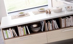 Essenza обработка шпоном с полимерным покрытием: плита МДФ (класс E1) толщиной 22 мм, с задней стороны меламиновое покрытие белого цвета; передняя сторона и края покрыты полимерной пленкой (ПВХ), доступной в следующих версиях: под дерево с отделкой "tranchè"; матовая однотонная отделка "matt", под дерево с отделкой "melinga" (прожилки с небольшим рельефом под дерево); однотонная отделка с глянцевой ровной поверхностью.