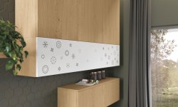 Дверца из опорной древесно-стружечной плиты (класс E1), меламиновой ламинированной, цветной или "под дерево", округленной по двум боковым сторонам и обработанно снизу и сверху крашеной кромкой из АБС толщиной 1 мм; при изготовлении используется термореактивный полиуретановый клей. Может быть в исполнении: гладкая поверхность или "smart" (слегка выпуклая текстура дерева) или с выпуклым декоративным элементом (только для опц. 366).