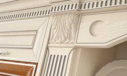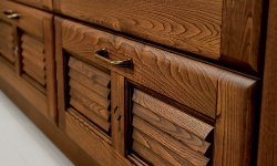 Дверцы с рамой толщ.24 мм из массива ясеня с плитой, шпонированной ясенем, с горизонтальной фрезеровкой в оттенках: окраска под орех с брашированием, сливки декапе с брашированием, веревка декапе с брашированием, глина декапе с брашированием, лакированный белый.