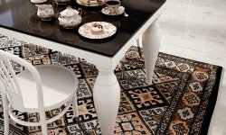 Рамка и филенка из массива ниима (Азадирахта индийская); покрытие краской на основе растворителя цвета орех, прозрачная акриловая грунтовка и акриловая матовая отделка со степенью блеска 20 единиц (полуматовая поверхность) для модели Laura noce; покрытие акриловой краской голубого цвета или цвета слоновой кости, морение с использованием средств для старения дерева на основе спирта, акриловая грунтовка и матовая отделка со степенью блеска 10 единиц (матовая поверхность) для модели Laura Avorio и azzurro decapè.