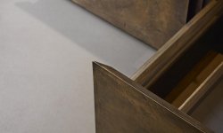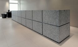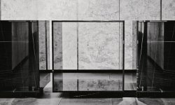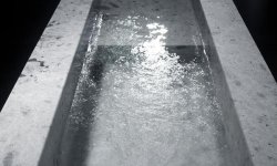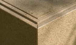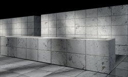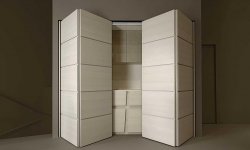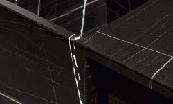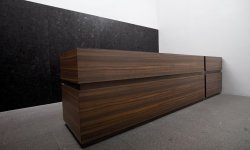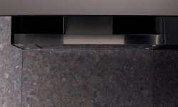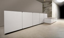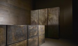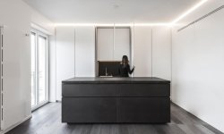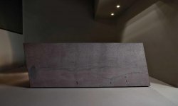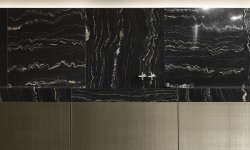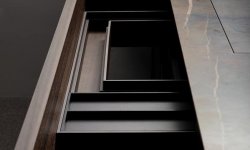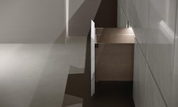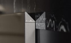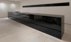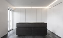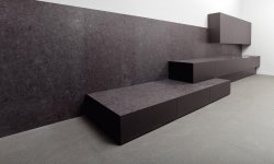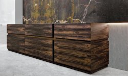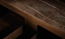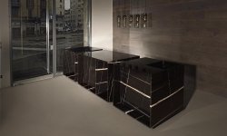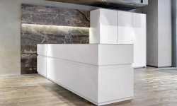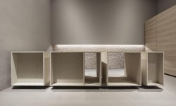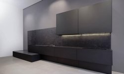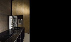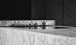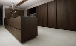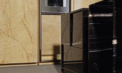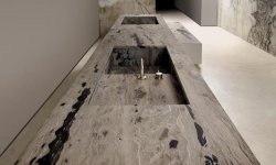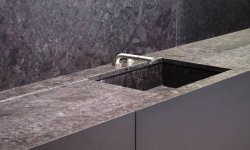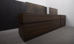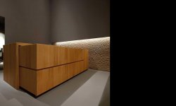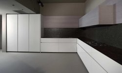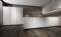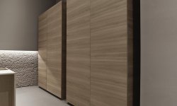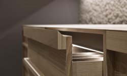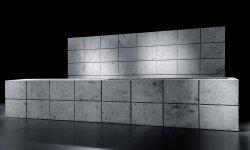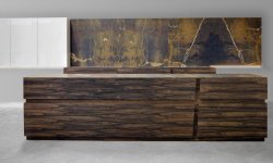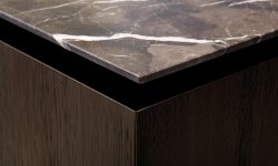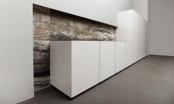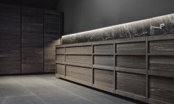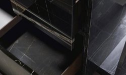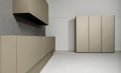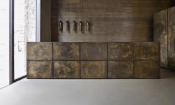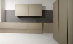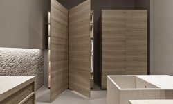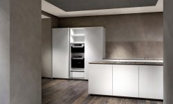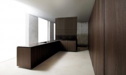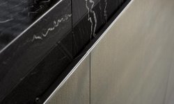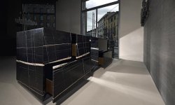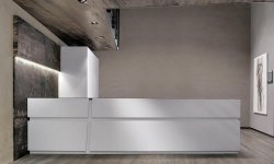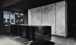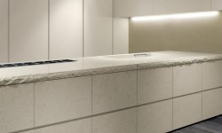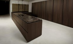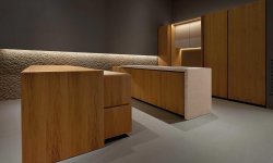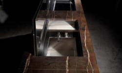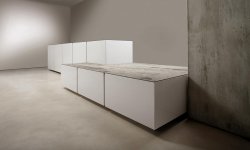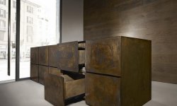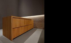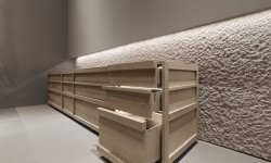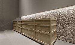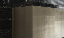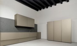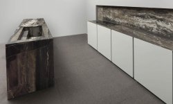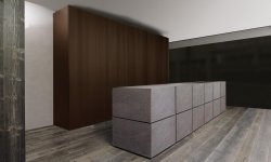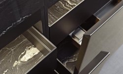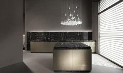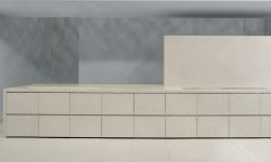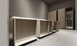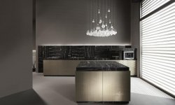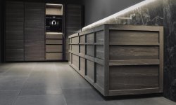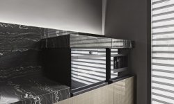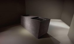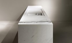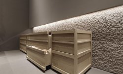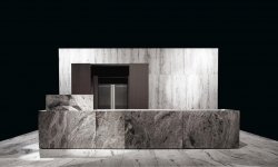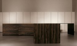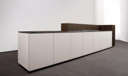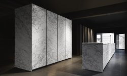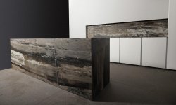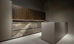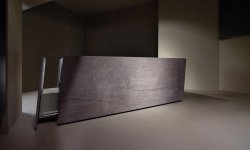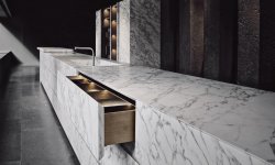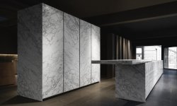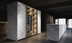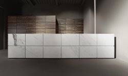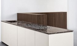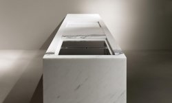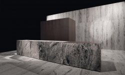45-градусное отношение между рабочей поверхностью и фасадами, вместе с небольшими вертикальными и горизонтальными канавками, определяют поверхность, характеризующуюся правильной каденциальной геометрией. Шкафы отмечены тем же. Терра полностью выполнена в камне, также доступна в дереве или в глянцевом или матовом лаке. Светлая композиция: остров с основанием и копланарными колоннами из белого лабрадорита, шлифованная пескоструйная отделка.