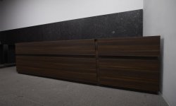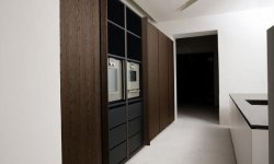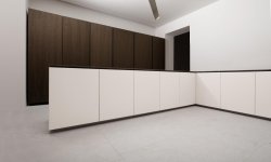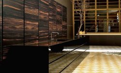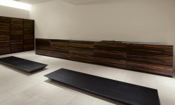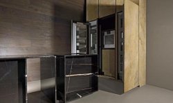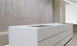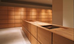 Остров с варочной панелью имеет выдвижную вершину и сделан из ароматного кедрового дерева. Под сдвигаемой частью столешница из белого камня Хоккайдо. Остров с раковиной имеет рабочую поверхность и мойку из белого камня Хоккайдо, двери и фасады из ароматного кедрового дерева. Колонны шкафов из кедрового дерева.