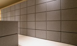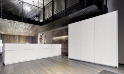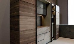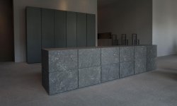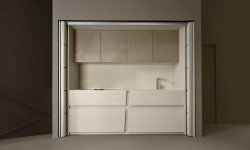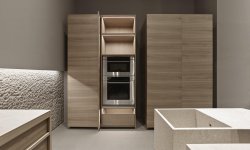 Колонны шкафов со складными фасадами из серого и окрашенного в серый цвет эвкалипта. Внутри - кассетница с ящичками и корзинами из эвкалипта, окрашенного в серо-бежевый цвет, рабочая поверхность из бежевого камня ляпис и элементы из теплого серого бетона.