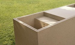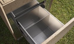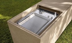 Наружная одноблоковая кухня со структурой из аустенитной нержавеющей стали, газовый барбекю для наружного использования со скользящей каменной крышкой. Каменный бассейн-мойка со скрытыми отводом, вода выходит из отверстия, сделанного непосредственно в камне. По бокам две корзины из нержавеющей стали, которые открываются с помощью шариковых направляющих из нержавеющей стали.