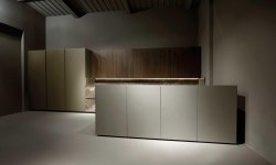 Maya из светлого полированного алюминия, рабочая поверхность из нержавеющей стали. Композиция вдоль стены — серого цвета, шкафы — в матовом глиняном лаке, а стены — в темном вязе.
