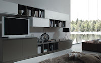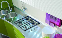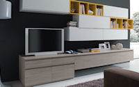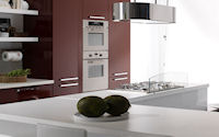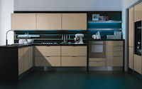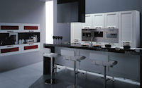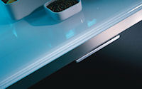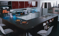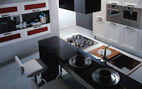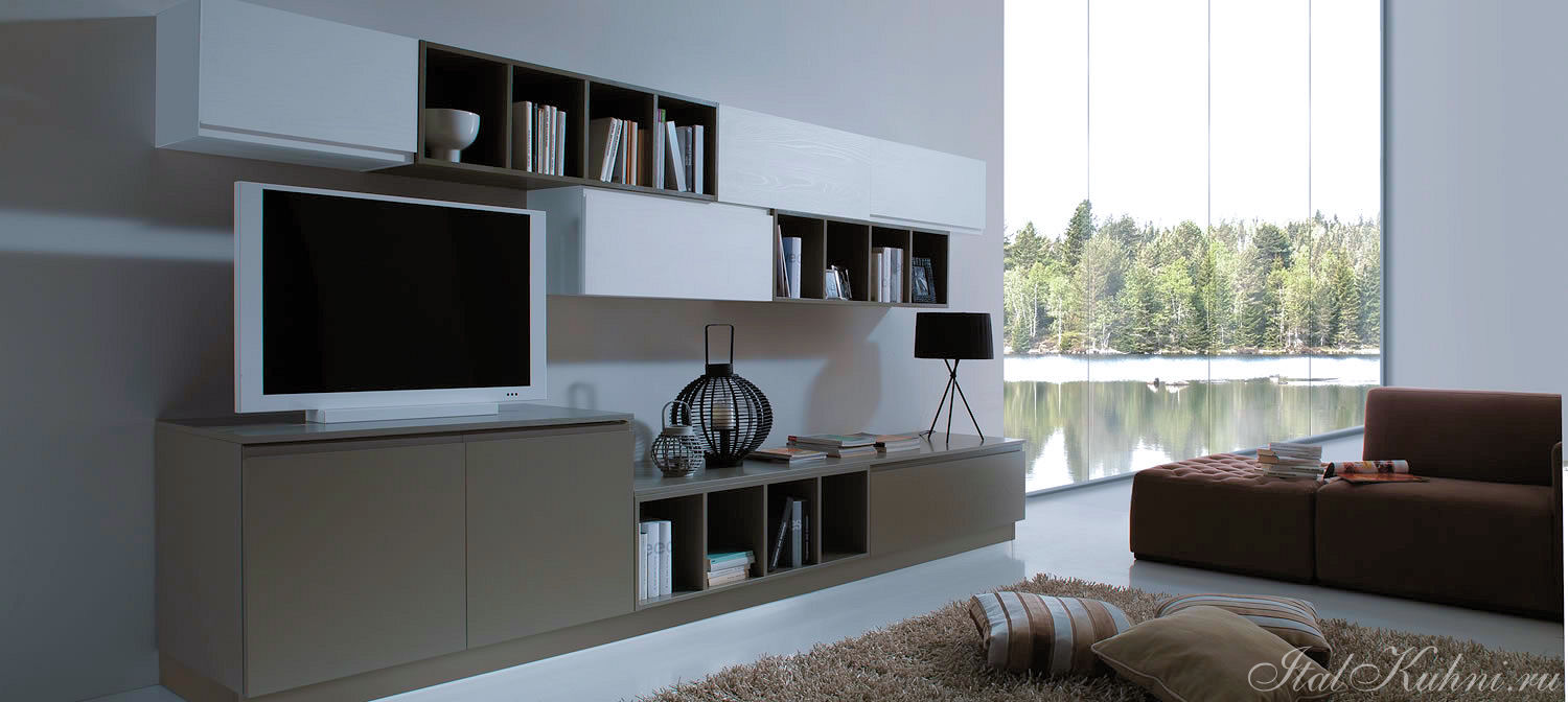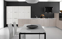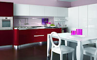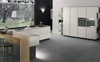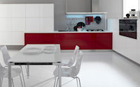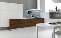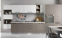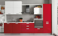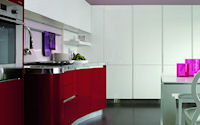 Двери и ящики: Двери и ящики в ламинате глянцевом в цветах bianco и rosso, или в меламине с постформингом отделка larice bianco и grigio. Двери со стеклом с алюминиевым профилем в цветах: bianco, nero, moka, corda, rosso, arancio, fum´e или satinato.