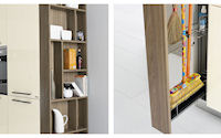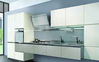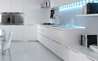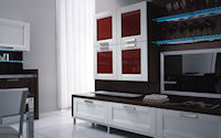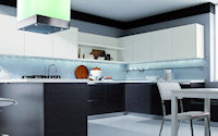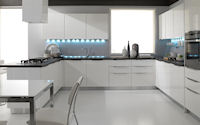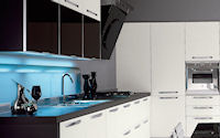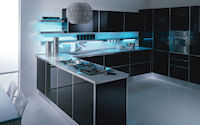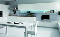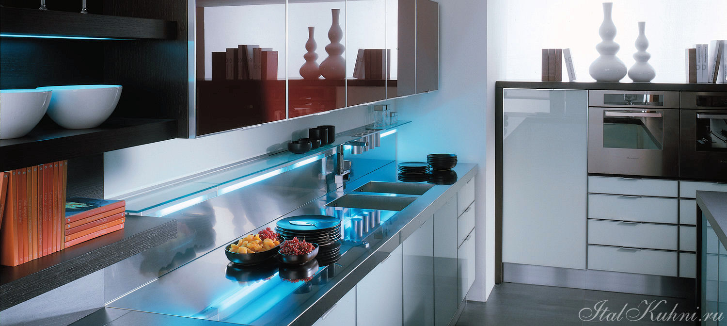 Аксессуары: подвесная рейка с подсветкой, подвесные шкафы с подсветкой, открытые полки с подсветкой с алюминиевой кромкой, подвесная рейка с подсветкой Led, открытые полки глянцевые или матовые в одном из цветов RAL.