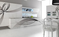 Двери: 1) Двери из MDF в глянцевых и матовых цветах. 2) Двери из MDF в глянцевых цветах с декором Fantasy. 3) Двери шпон ясеня в цветах bianco, grigio, tabacco, moro. Расположение декоров Fantasy варьируется в соответствии с расположением кухни. Для подробной информации по разработке заказа обратитесь к прайсу.